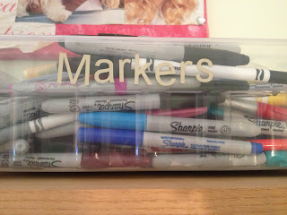 Clean space to use my tools !! yippy!!I got shoe box containers from the dollar store and stored my markers, pens and gel pens in them. I labeled each container...